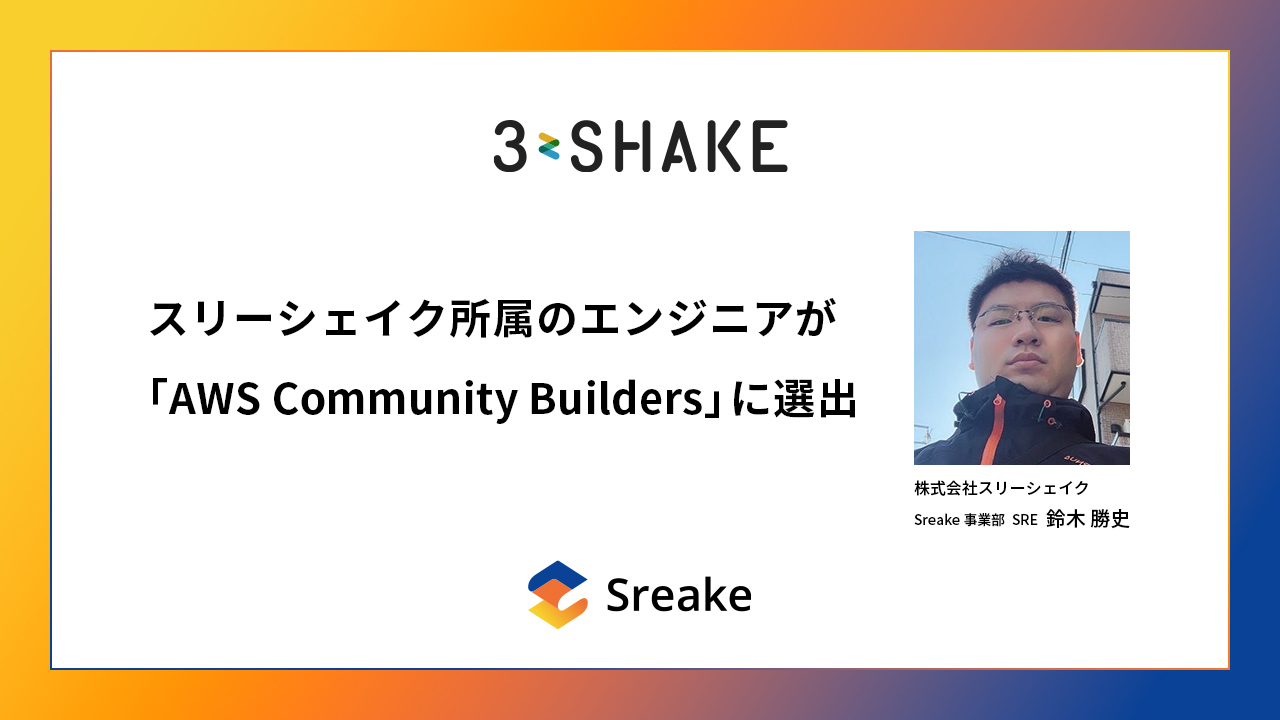 株式会社スリーシェイク(本社:東京都新宿区、代表取締役社長:吉田 拓真、以下スリーシェイク)に所属の鈴木 勝史が、「AWS Community Builders」に2年連続で選出されたことをお知らせします。