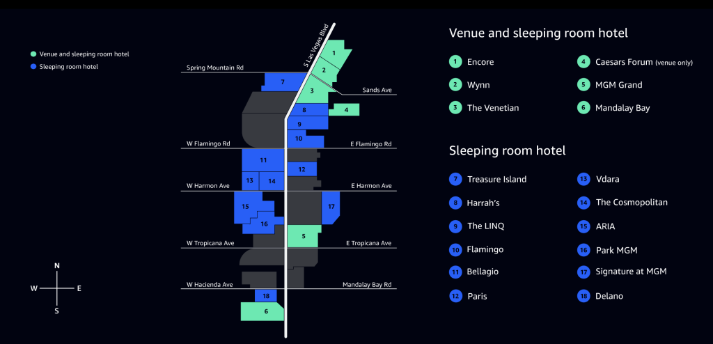 会場はラスベガスのメインストリートであるストリップ通りに沿ったホテルが会場で、今回は通りにある Encore, Wynn, The Venetian, Caesars Forum, MGM Grand, Mandalay Bay の 6 つのホテルがセッション会場として利用されました。