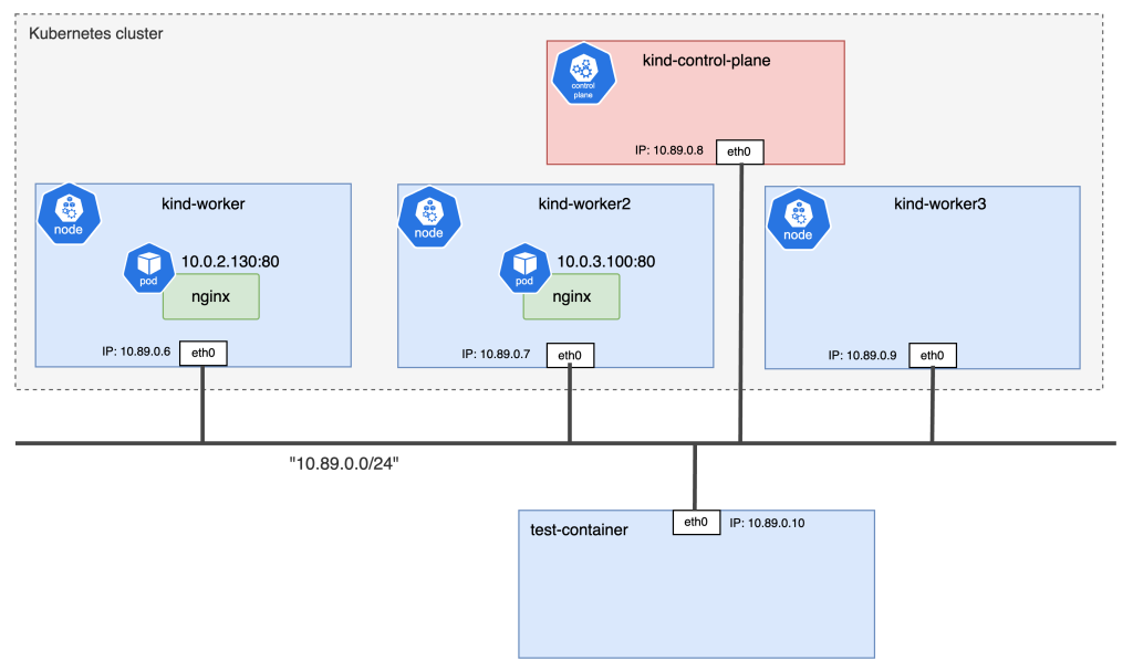 Podmanでテスト用のコンテナ(test-container)をkindネットワークに作成して、クラスタ外からアクセスできるか確認します。test-containerを作成した後のネットワーク構成は、下の図のようになります。