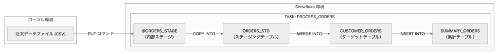 毎日定期的に顧客から新しい注文や更新された注文を受け取るため、可能な限りデータの取り込みと変換プロセスを自動化します。CSVファイルをSnowflakeの内部ステージに手動でのアップロード以降のプロセスは、データエンジニアがこれまでのステップを組み合わせて自動化し、毎晩など定期的に実行できるようにスケジュール設定することができます。