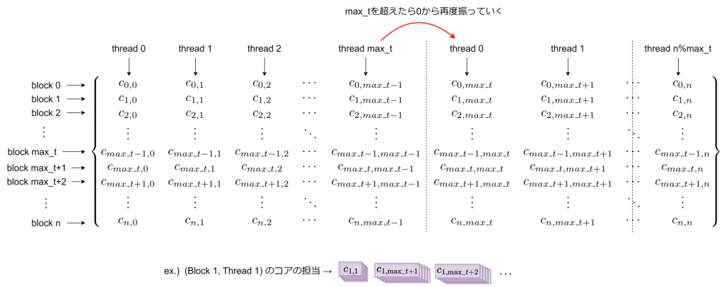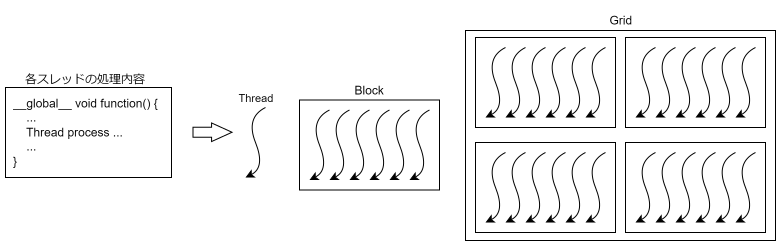 CUDAのプログラムでは、これらの項目の動作をそれぞれ定義していきます。