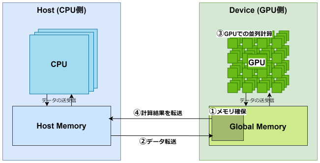 - デバイス上のメモリにホストからデータを転送 GPUデバイスで計算させたいデータをデバイス上のメモリに転送します。