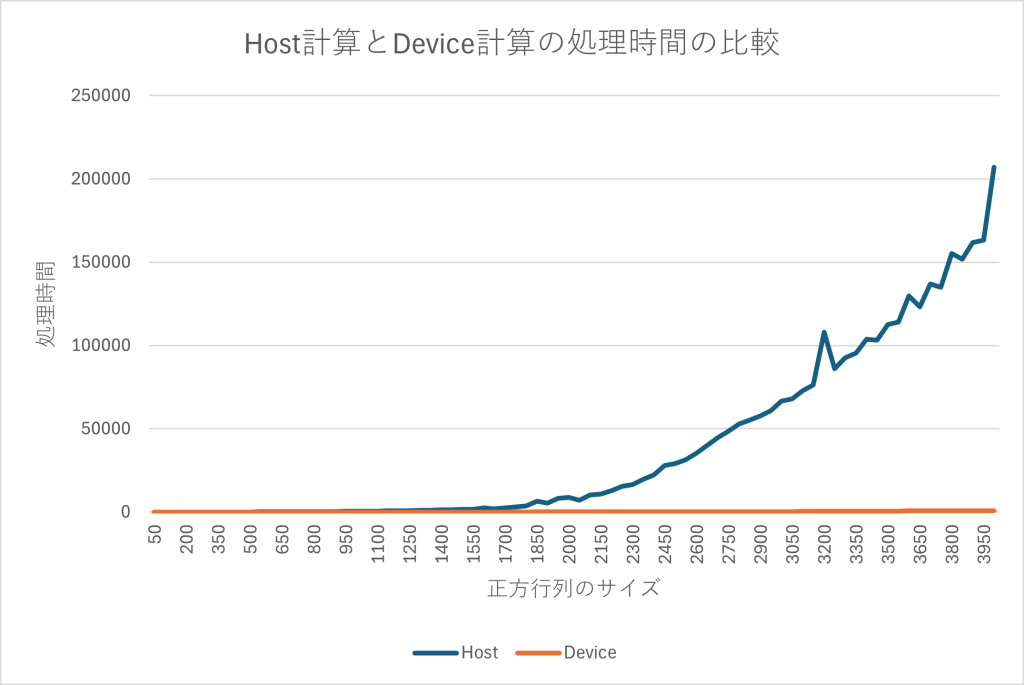 行列サイズが大きくなるほど、ホスト側での計算は多くなっていますが、それに比べてGPUでの計算は遥かに小さいことがわかります。