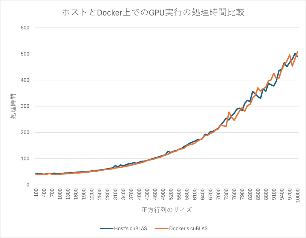 ホストでのcuBLASとコンテナでのcuBLASの処理時間の違いを見てみます。