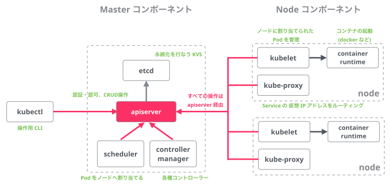 etcdには直接アクセスせず、kube-apiserverが通信の中継点として機能します。- 認証(Authentication)、認可(Authorization)、リクエストの検証(Admission Control)などを行い、 クラスタの状態の管理と安全性を保証します。