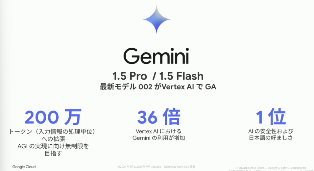 最新モデルのGemini 1.5の特徴は入力に用いることのできるトークン数が200万という、非常に膨大なコンテキストウィンドウを持つ点です。これにより、グランディング時にデータ量の大きいファイルを入力することができ、LLMの課題の一つであるハルシネーションのリスクを低減させることができます。