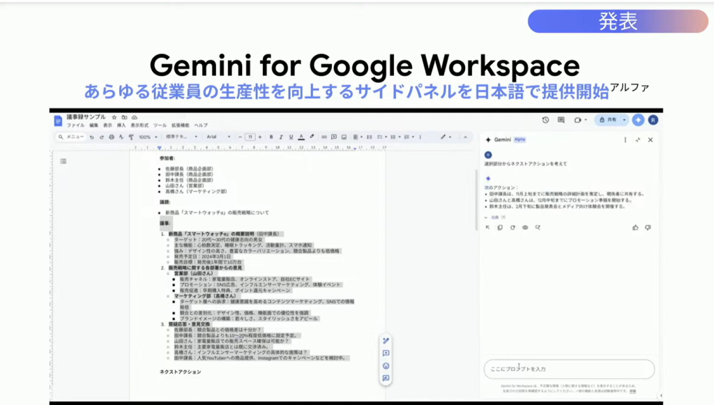 等、Google Workspace上のアクティビティをGeminiでサポートすることができます。