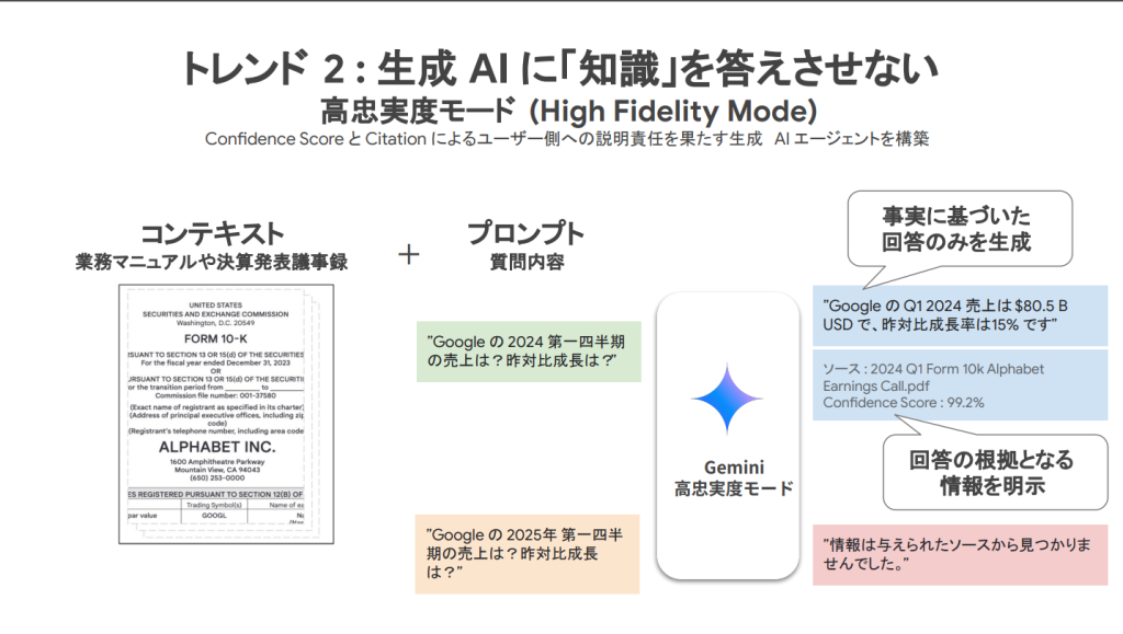 LLMが持つ独自の知識を答えたことによって、与えたコンテキストには存在しない情報や事実とは異なる出力を行うことがあります。この高忠実度モードを使用することで、与えられたコンテキストのみから回答を生成するよう強制することができるモードで、ハルシネーションのリスクを抑えてGeminiを利用できるようになります。