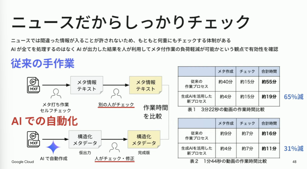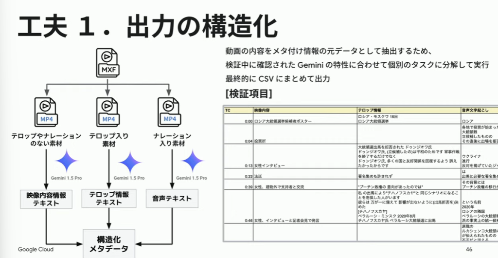 人の手で3分の動画にメタ付けを行うのに約40分かかるのに対し、Geminiを用いると約4分で完了するとのことです。