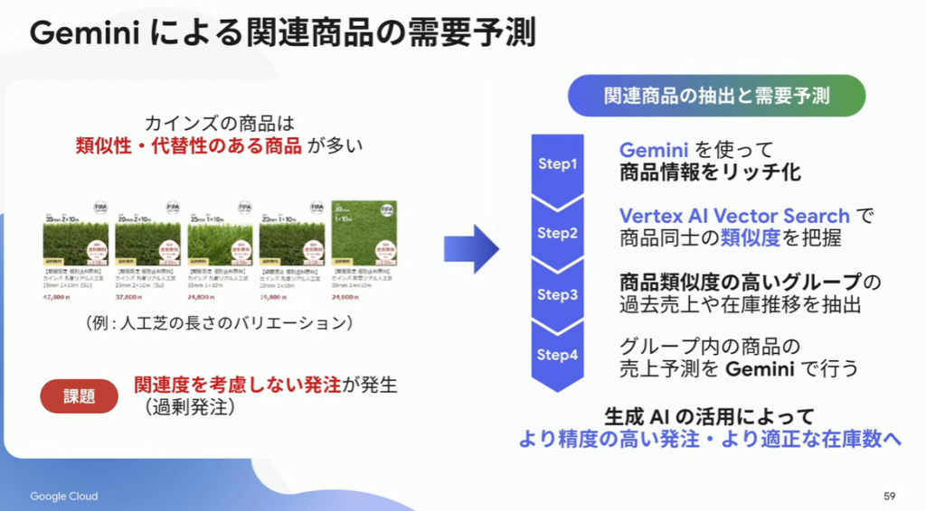 そこで、Geminiを用いた商品情報のリッチ化、Vertex AI Vector Searchで類似度を算出して似た商品同士でグループ化したことにより、より適正な商品管理が行えるようになりました。