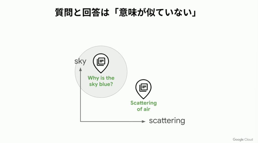 「なぜ空は青いのか?」をエンベッディングしたベクトルと「空気の散乱」をエンベッディングしたベクトルの間類似度は小さいものになり、うまく答えを取得することができないのです。