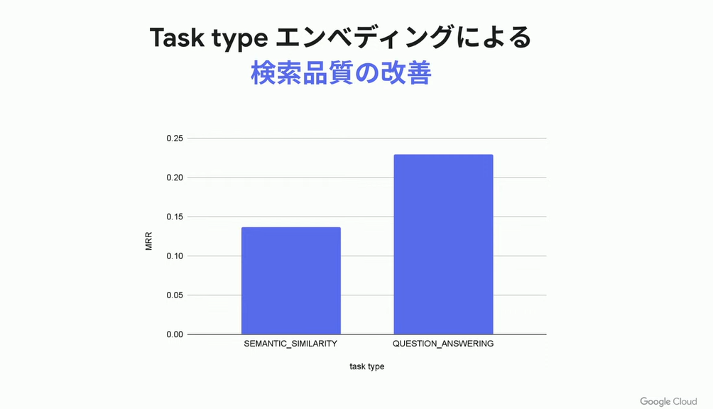 Vertex AI Embeddingsでは Task typeエンベッディング という機能によって質問と回答をエンベッディング空間内の近い位置に配置することで検索品質を向上させています。