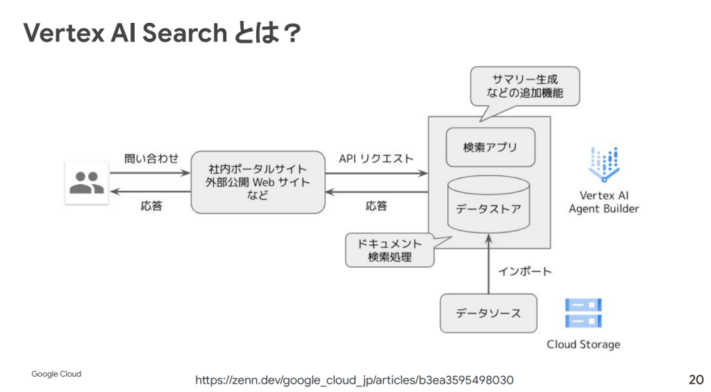 なお、Vertex AI において検索アプリケーションを作ることができるものは Vector SearchVertex AI search の2つがあります。