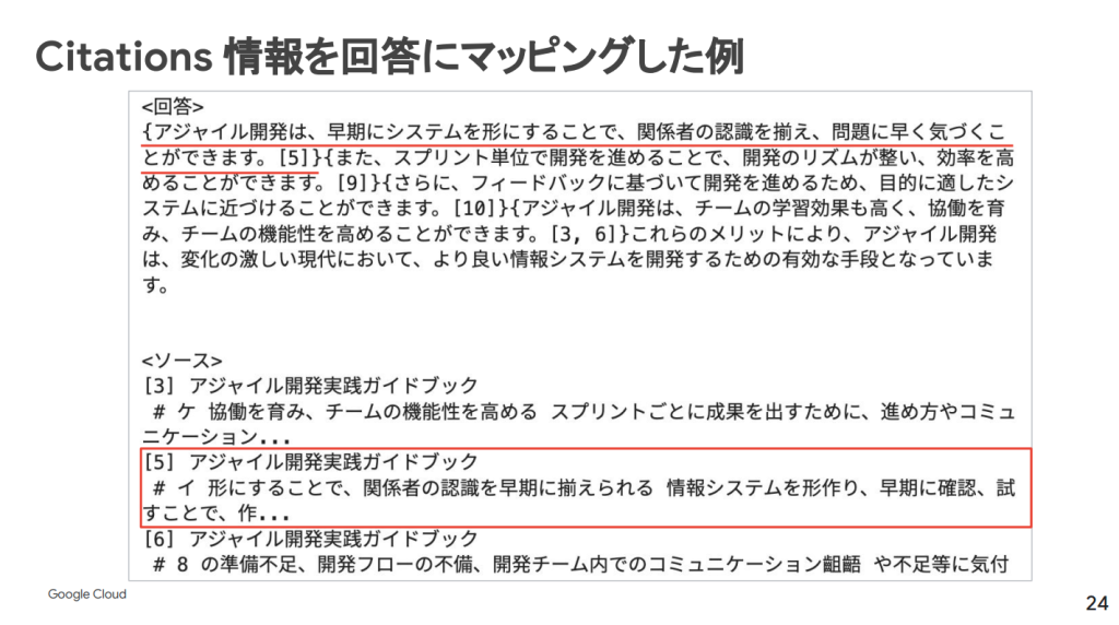Vertex AI Search の Answer APIを用いてグラウンディングを行うと、出力に出典情報が付与され、データソース内のどのデータから参照された情報かを知ることができます。