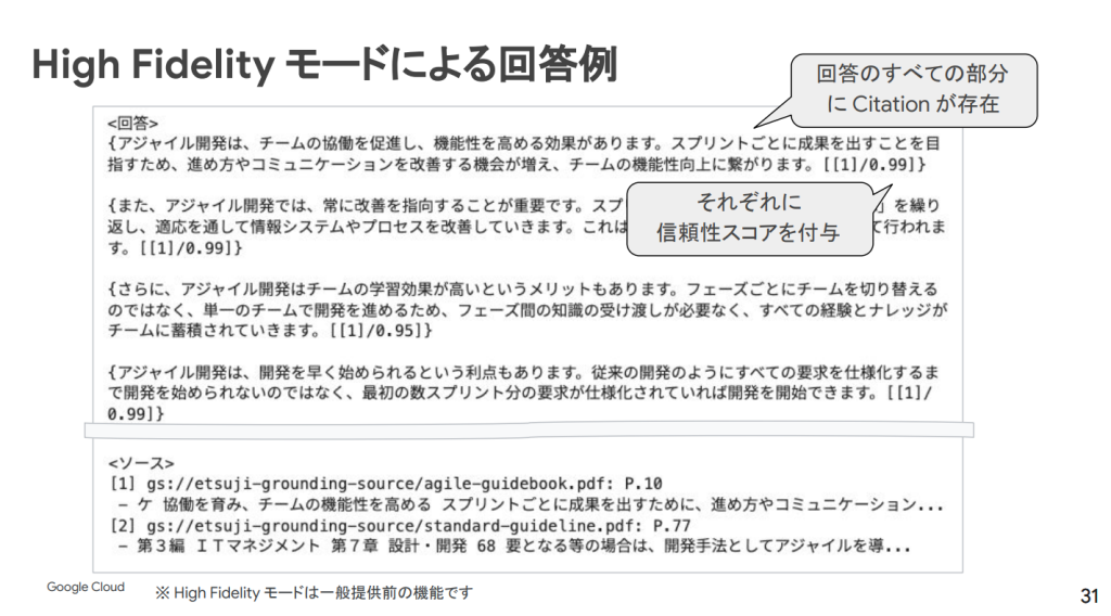 グランディングによって誤った情報の出力は避けることができますが、現状LLMの独自知識による回答が生成されることがあります。ユースケース次第ですが、出典のない情報を出力しない高信頼性モードの開発を公開しています。