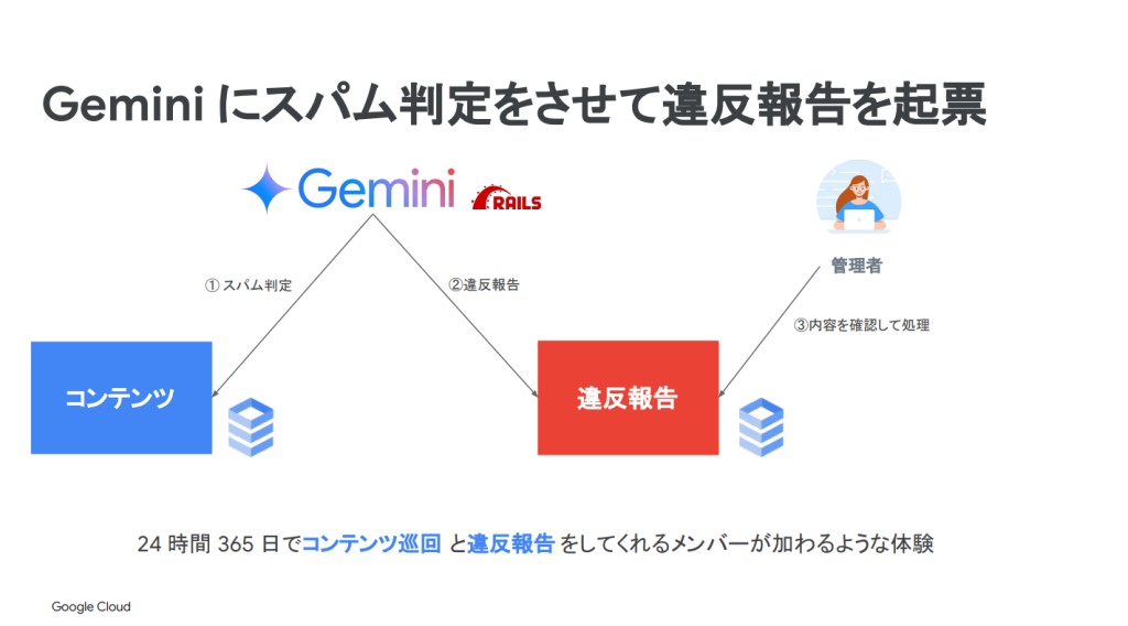 そこで、Geminiを活用した取り組みとして、24時間365日でコンテンツ巡回と違反報告を行うアプリケーションを作成しました。このアプリはコンテンツが格納されたCloud SQLからデータを取得し、Geminiにコンテンツとプロンプトを渡すことで、スパム判定をさせるというものです。これは人力チェックと比較して75%のコスト削減になりました。