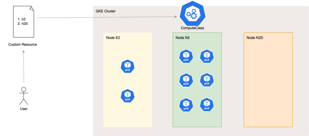 例えば、n2のインスタンスを最優先で利用し2番目にn2dのインスタンスを利用したいというルールをカスタムリソースで作成・適用すると、コンピューティングクラスに関連付けられているPodはn2ノードにスケジューリングされます。