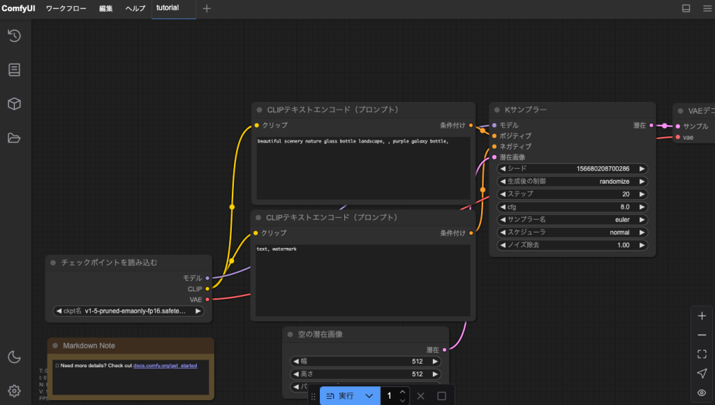 この状態で http://EC2のIPアドレス:8188 にブラウザからアクセスするとこのようにComfyUIを使うことができます。