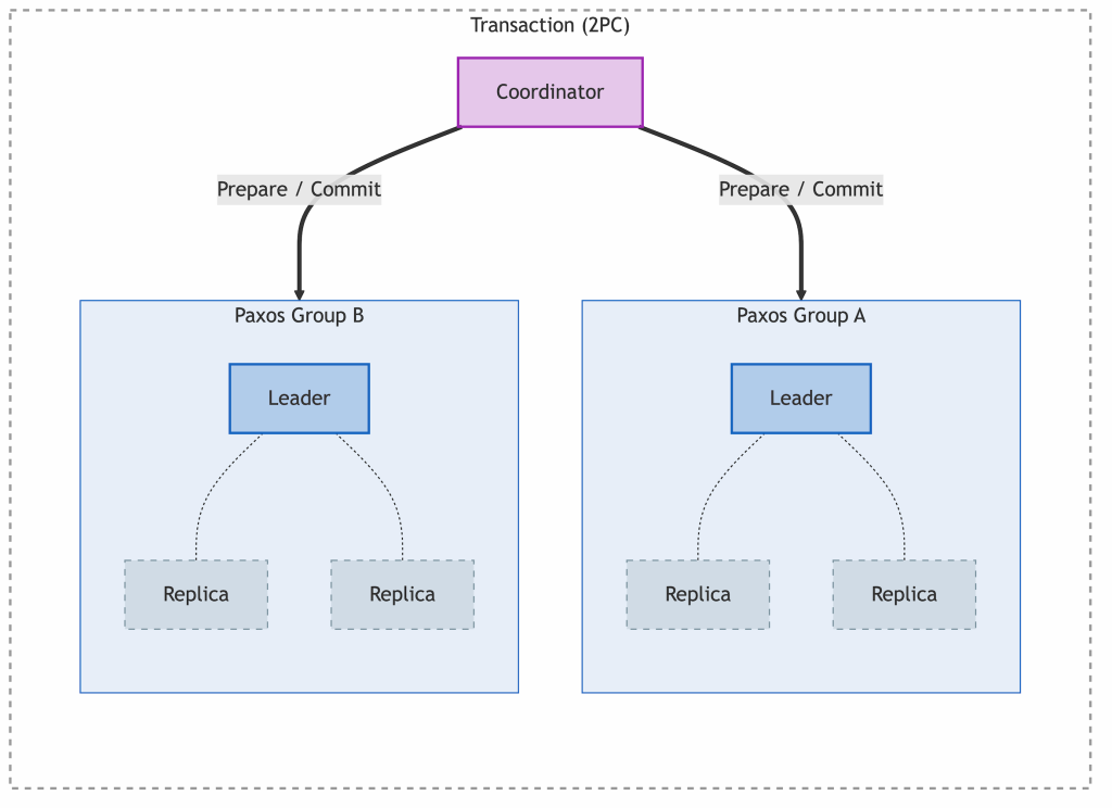 これに対して,Spanner の 2PC における参加者は Paxos Group (i.e. 複数台のチーム) であり,チーム内の誰かがダウンしても,過半数が生きていればチームとしては正常に稼働し続けます.つまり Spanner は,2PC の最大の弱点である可用性の低さを Paxos の強靭さでカバーすることで,止まらない 2PC を実現しているわけです.