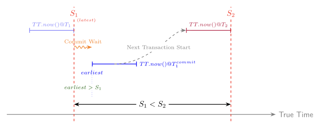 Cloud Spanner は [katex]T_2[/katex] のタイムスタンプ ([katex]S_2[/katex]) を決定する際,その時点の不確実な区間の「未来側 (latest)」を採用していました.つまり [katex]S_2[/katex] は,必ずその瞬間の実時間以上の値になります.
