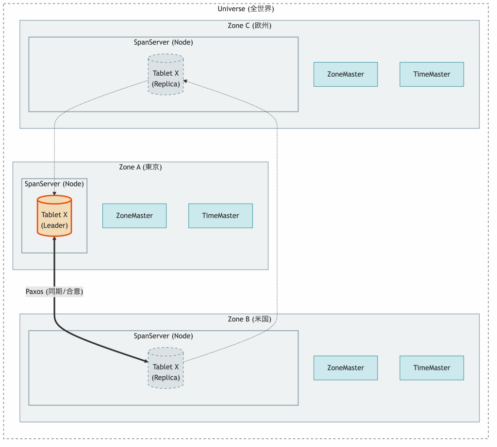 Spanner は,分割されたデータ単位である Tablet を,常に複数の Zone (通常 3 つ以上) へ複製することで可用性を担保しています.この分散したレプリカ間で整合性を保つために採用されたのが,分散合意アルゴリズムとして実績のある Paxos です.