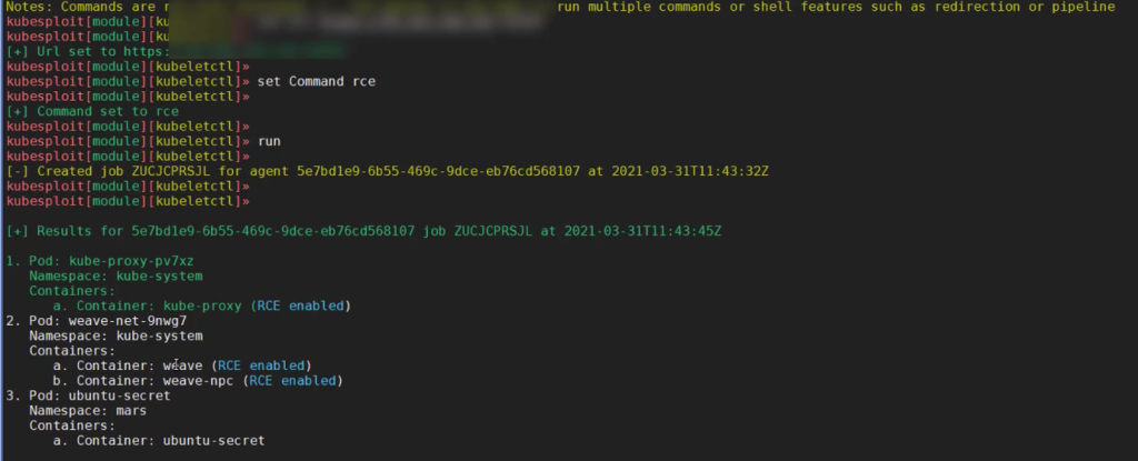 kubesploit [module][kubeletctl] > set Command run -a whoami