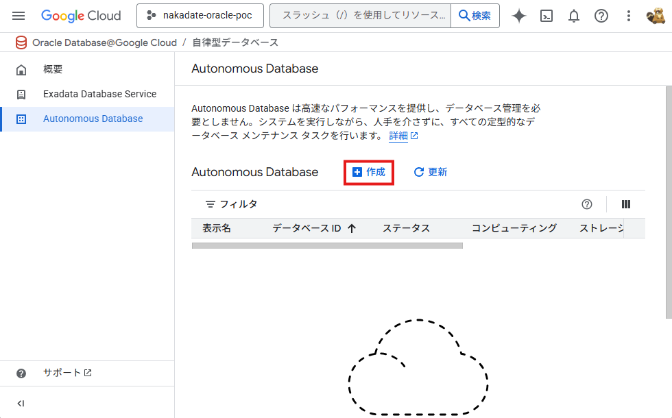 3. 画面中央の作成を押下し、Autonomous Databaseの作成画面に移動する