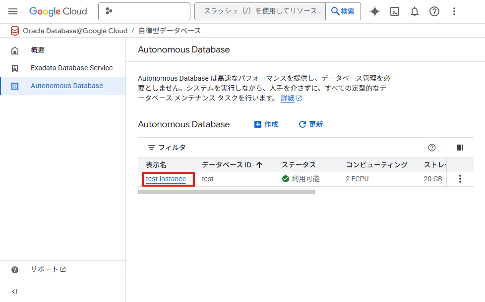 3. 画面中央にある対象データベースの表示名を押下しAutonomous Databaseの詳細画面を表示する