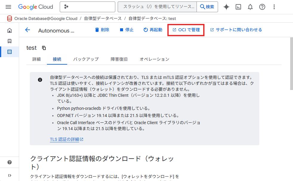 5. 画面上部の「OCIで管理」を押下し、より詳細な情報を確認する