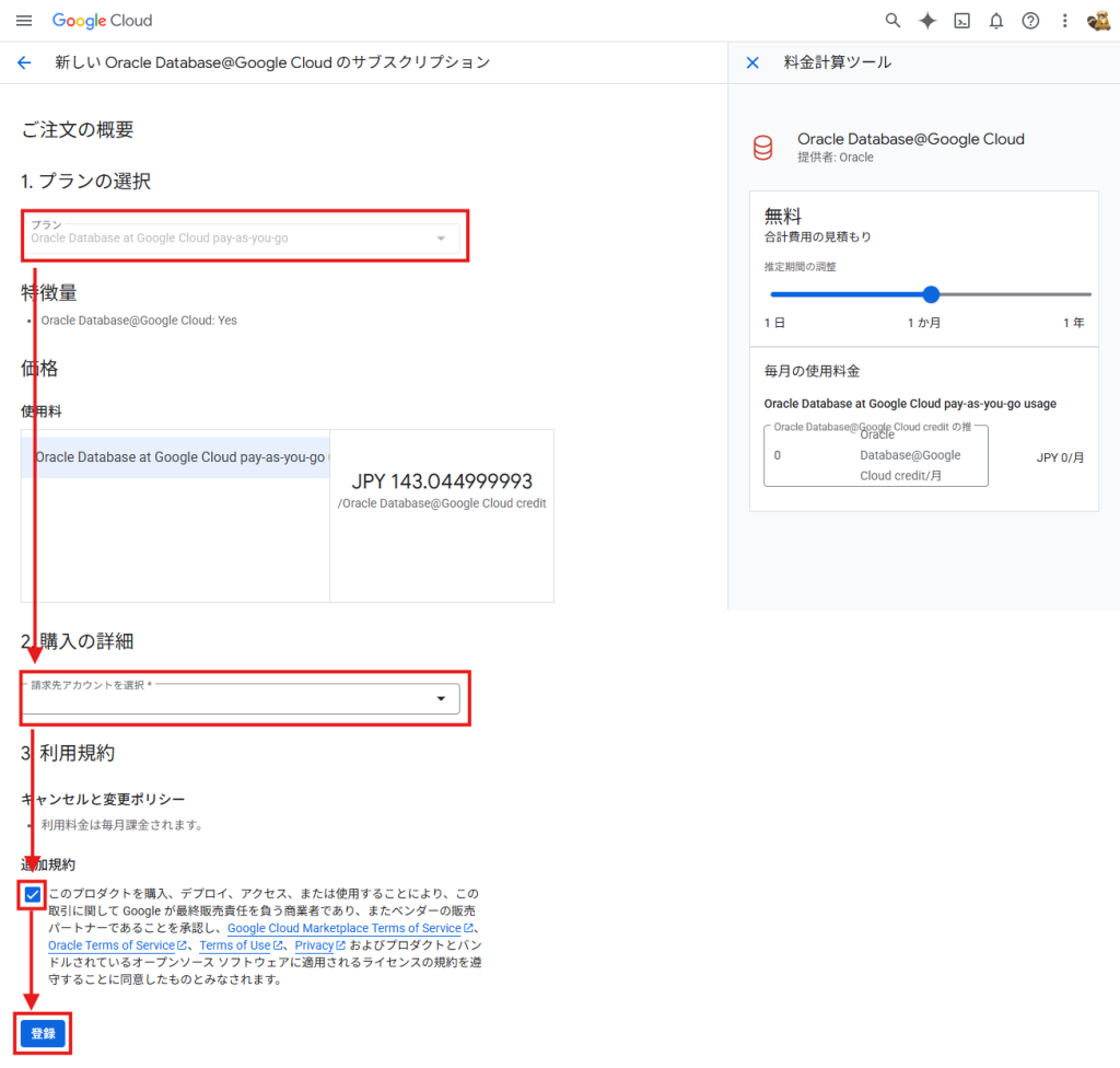 - 各種項目を選択し、Oracle Database@Google Cloudのサブスクリプションを行う 下記の項目を設定し、登録を押下する。