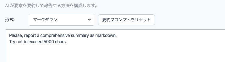 最後に作成するレポートのプロンプトを作成します。こちらもデフォルトのプリセットを利用します。形式はMarkdownに変更しておきます。