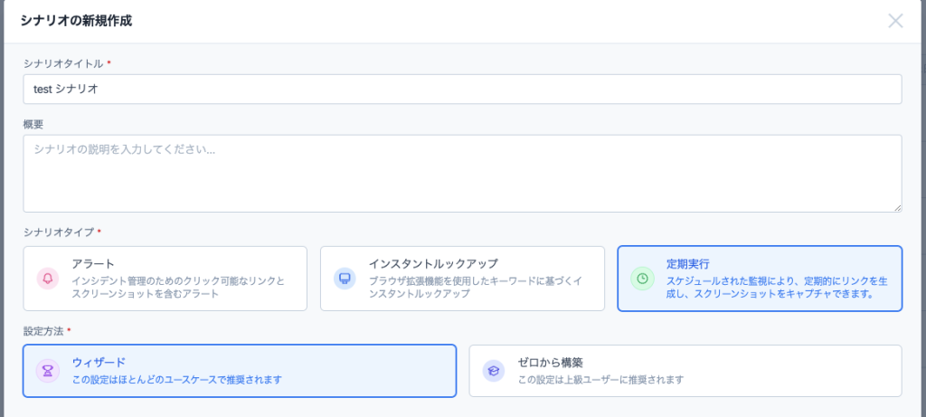 今回はテストでひとまず定期実行に設定します。また、初心者なので、推奨されるウィザード形式で作成していきたいと思います。