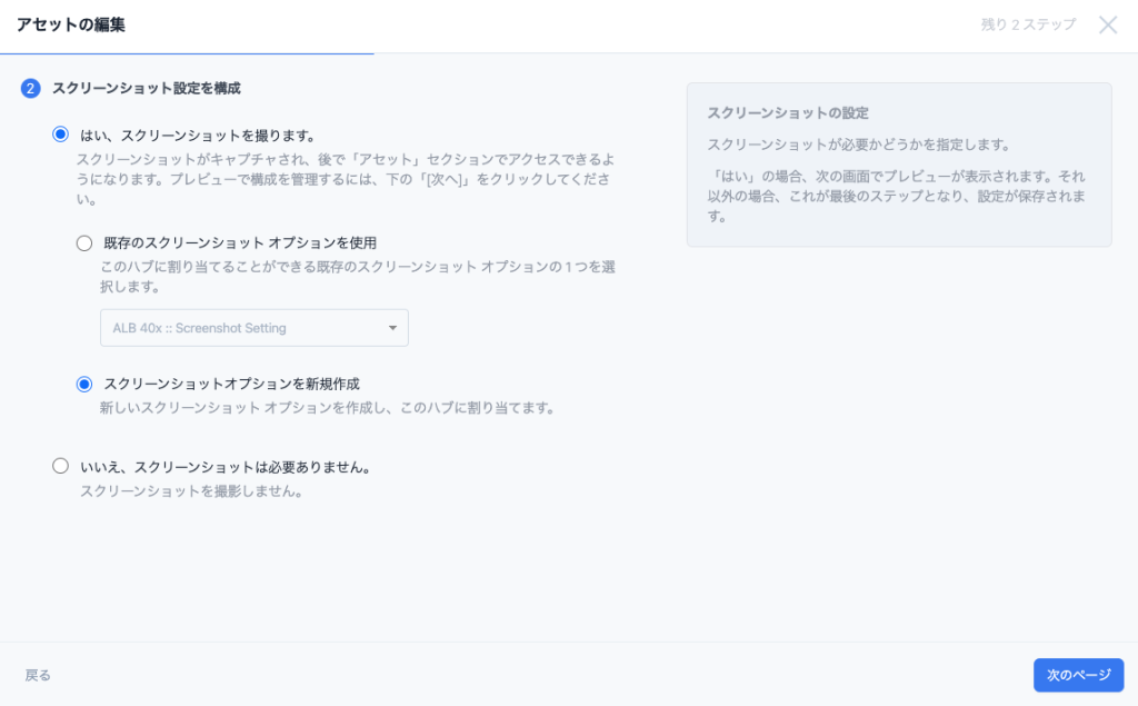 次のページでスクリーンショットのサイズと取得のタイミングを設定します。
