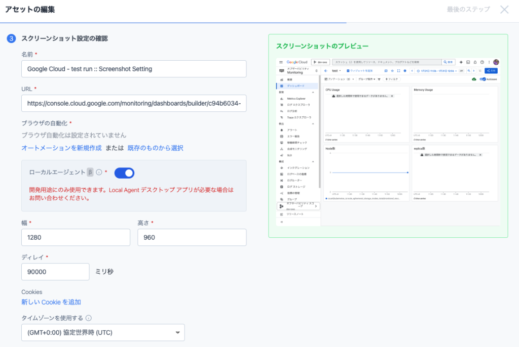 アセットはどのURLでどの画面を取得するかを定義するもので、URLとスクリーンショットの設定を行い、それに名前をつけて管理できるそうです。