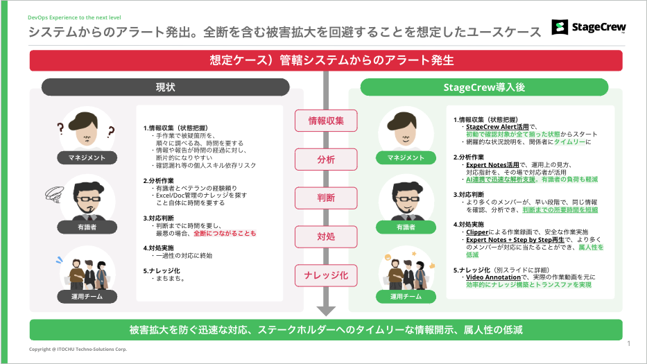 StageCrew™(https://stagecrew.ai/)は、システム監視やログ収集、トランザクションのトレースといった各種管理ツールに対するアクセスを自動化、インシデント発生時の対応フローやパターンを可視化して、オブザーバビリティの向上を実現するクラウドサービスです。