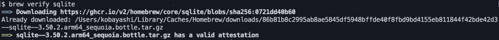 Homebrew (2024/05/14のSigstoreブログ) β機能であり、GitHubとHomebrewで現在も開発を行っています。 GitHub Artifact Attestations(sigstoreを使用)により、GitHub Actionsでビルド時に署名ができるようになりました。これは、Actions→Attestationsから確認することができます。 それを活用することで、Homebrewの公式formulae(Homebrew/homebrew-core)にあるパッケージは全て署名されています。homebrew-coreにあるパッケージのAttestationsはこちらにあり、ghコマンドで検証できます。 brewコマンドでもtrailofbits/homebrew-brew-verifyを使うことで、brew verify で検証できますが、2025年9月時点でもアップストリームには組み込まれていません。また、環境変数に HOMEBREW_VERIFY_ATTESTATIONS=1 をセットすることで、インストール時に検証することもできます。 詳細は、ブログを見てください。また、GitHub Artifact Attestationsによる署名・検証はGitHubのドキュメントが参考になります。