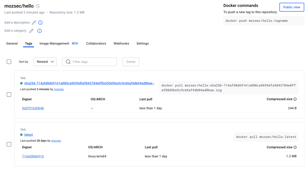 ”Hello, World!”を出力するシンプルなバイナリを含むコンテナイメージmozsec/helloを署名し、その署名を検証します。事前にコンテナイメージをpushしておく必要があります。