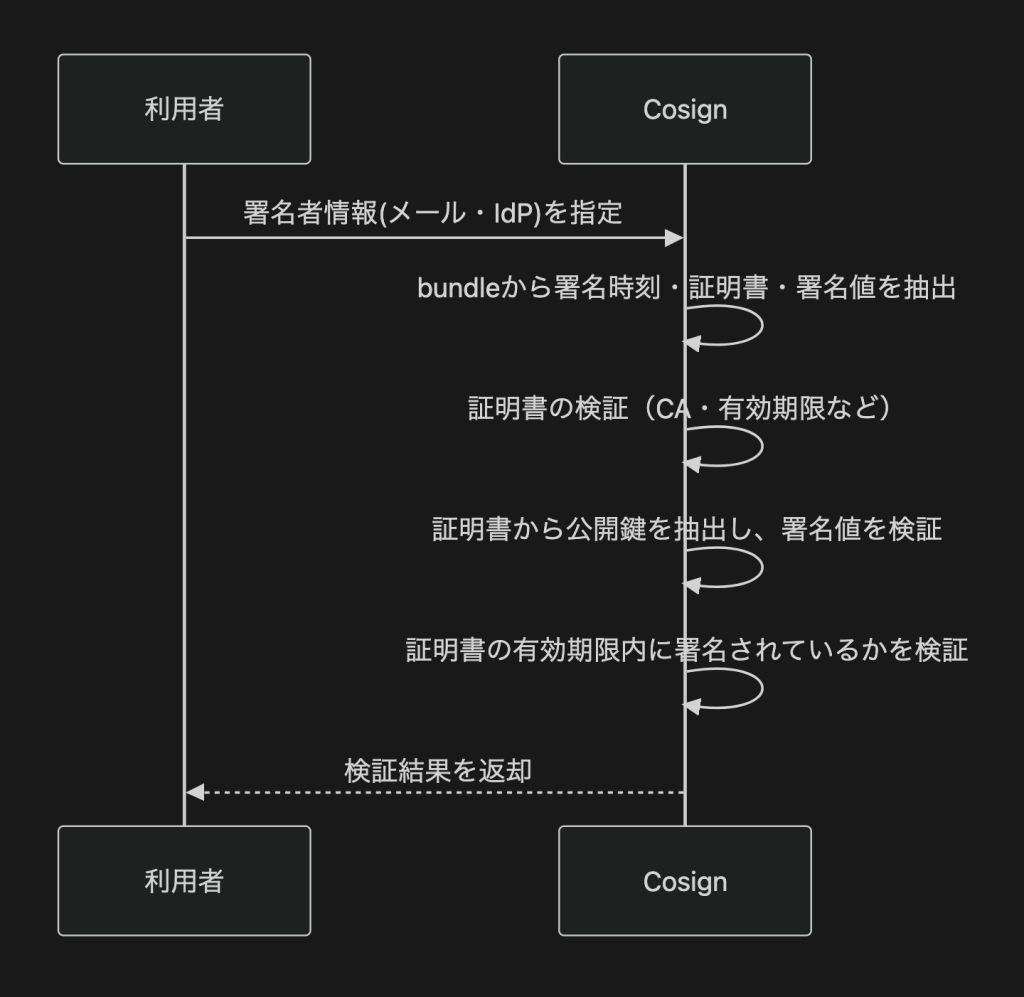 検証においても、公開鍵(GPG鍵)を使いません。代わりに、署名時に Fulcio が発行した証明書に含まれる署名者のメールアドレスやOIDC Issuer(IdPのURL)を検証ポリシーとして指定して、「誰の署名を信頼するか」をチェックします。