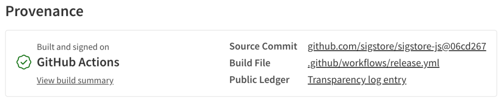 npm (2023/10/03のSigstoreブログ) npmパッケージのReadme下部にあるProvenanceに、パッケージがどこで作成され、誰が公開したのかが表示されます。 GitHub ActionsとGitLab CI/CDでビルドした場合に利用可能です。 詳しくはドキュメントを参照してください。