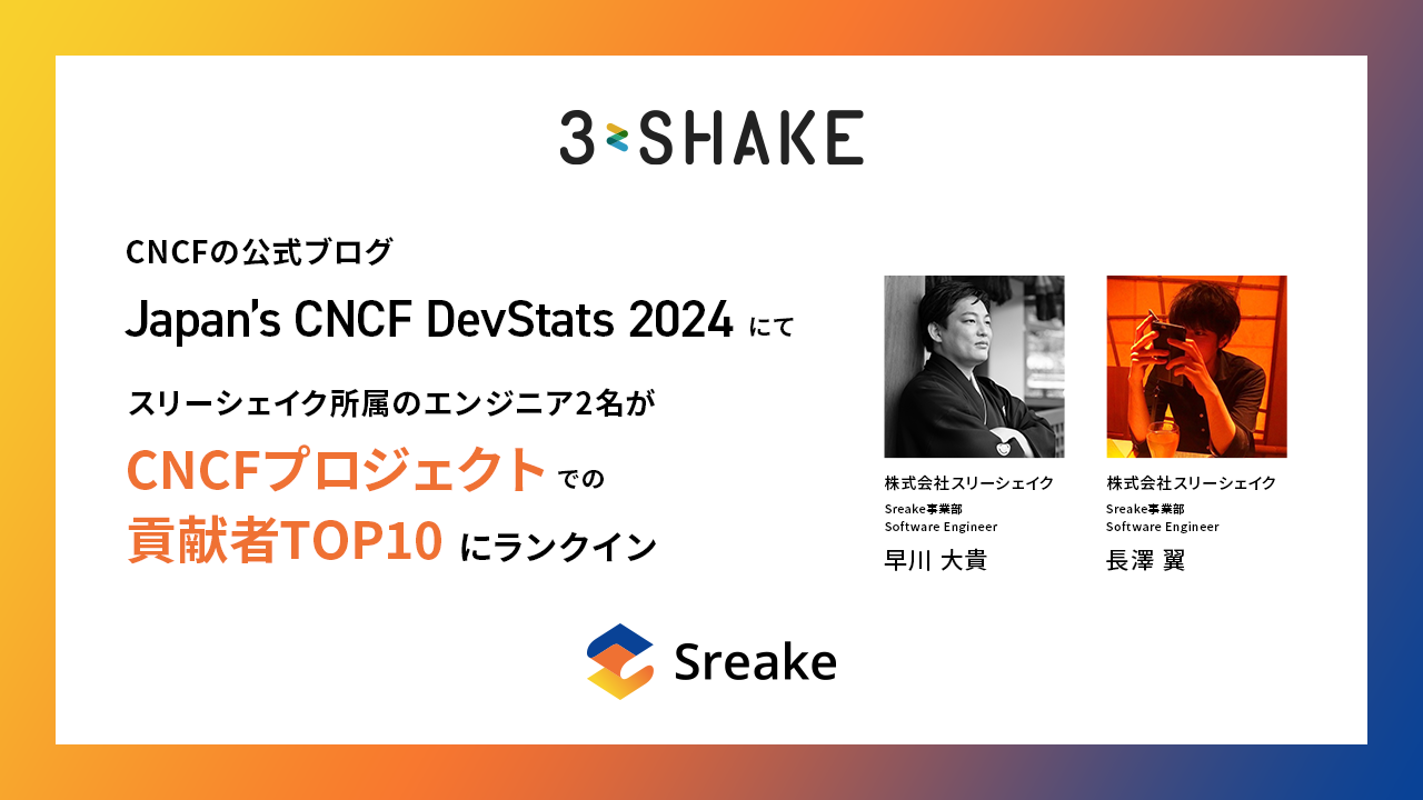 株式会社スリーシェイク(本社:東京都新宿区、代表取締役社長:吉田 拓真、以下スリーシェイク)は、 CNCF(Cloud Native Computing Foundation)の公式ブログ「Japan’s CNCF DevStats 2024」にて、スリーシェイク所属のエンジニア 早川大貴・長澤翼(以下早川・長澤)がCNCFプロジェクトでの貢献者TOP10にランクインしたことをお知らせします。